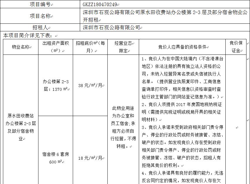 深圳市石观公路有限公司原水田收费站办公楼第2-3层及部分宿舍物业公开招租