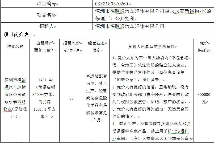 深圳市福骏通汽车运输有限公司福永永泰西路物业(原修理厂)公开招租