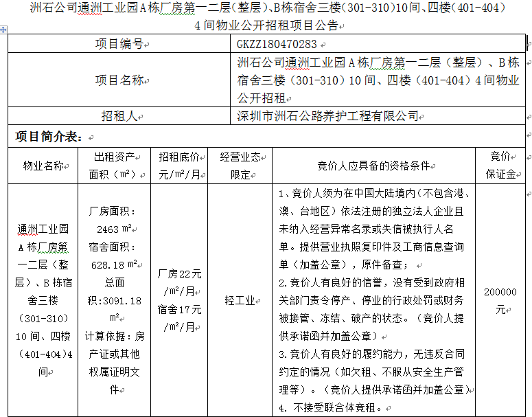 洲石公司通洲工业园A栋厂房第一二层(整层)、B栋宿舍三楼(301-310)10间、四楼(401-404)4间物业公开招租项目公告