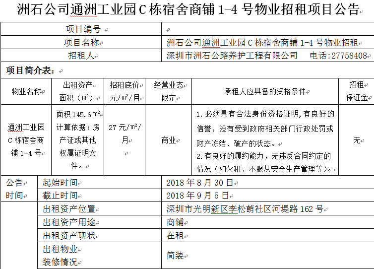 洲石公司通洲工业园C栋宿舍商铺1-4号物业招租项目公告