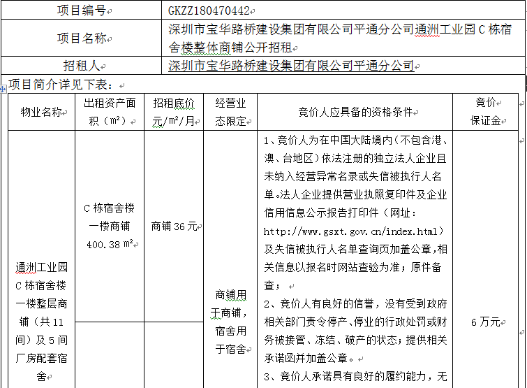 平通分公司通洲工业园C栋宿舍楼整体商铺公开招租公告