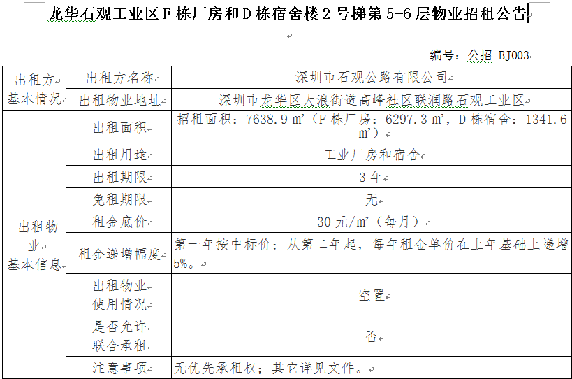 龙华石观工业区F栋厂房和D栋宿舍楼2号梯第5-6层物业招租公告