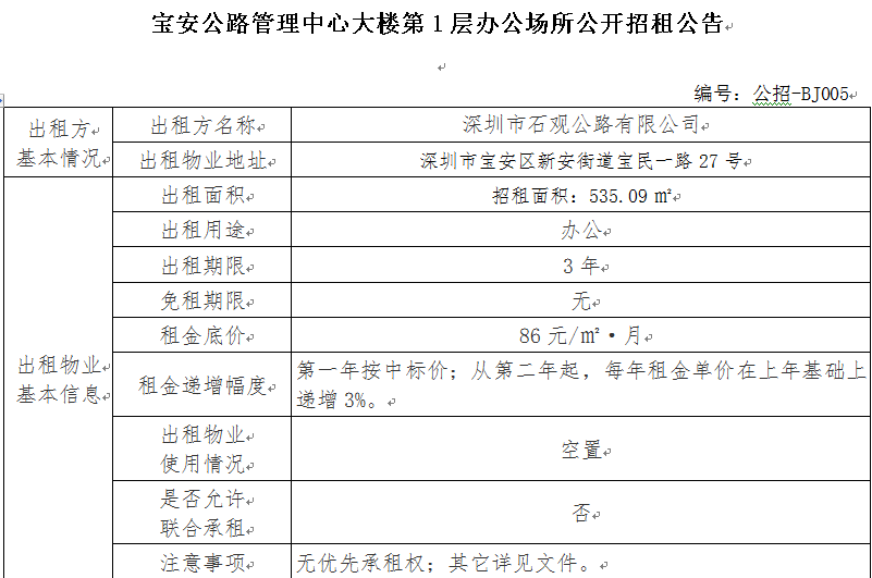 宝安公路管理中心大楼第1层办公场所公开招租公告