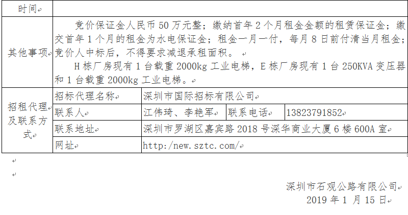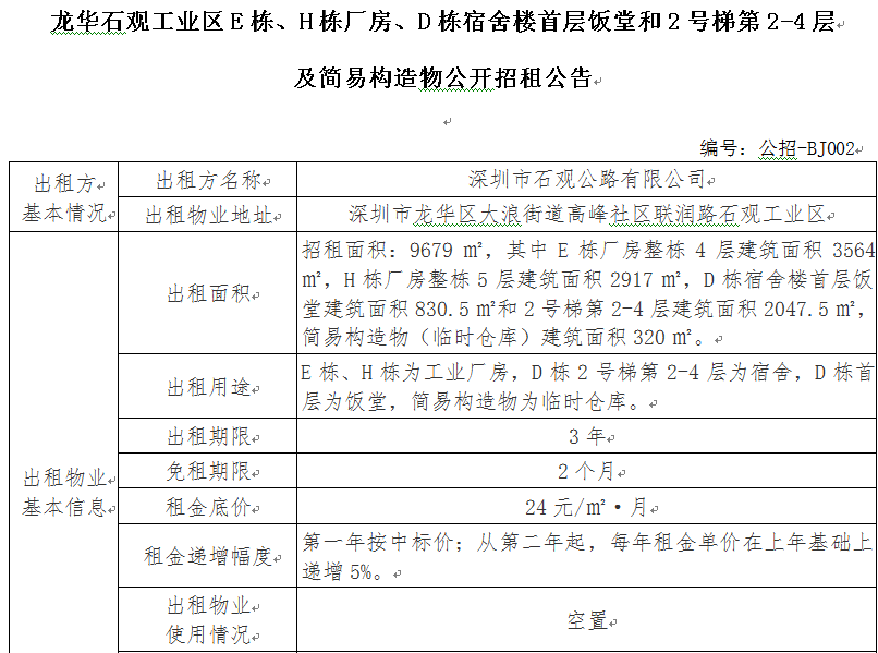 龙华石观工业区E栋、H栋厂房、D栋宿舍楼首层饭堂和2号梯第2-4层 及简易构造物公开招租公告