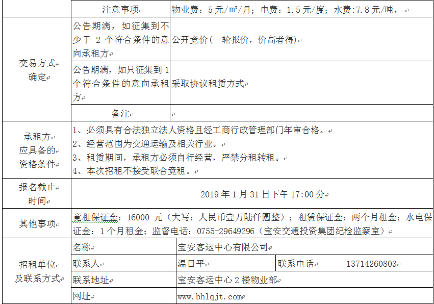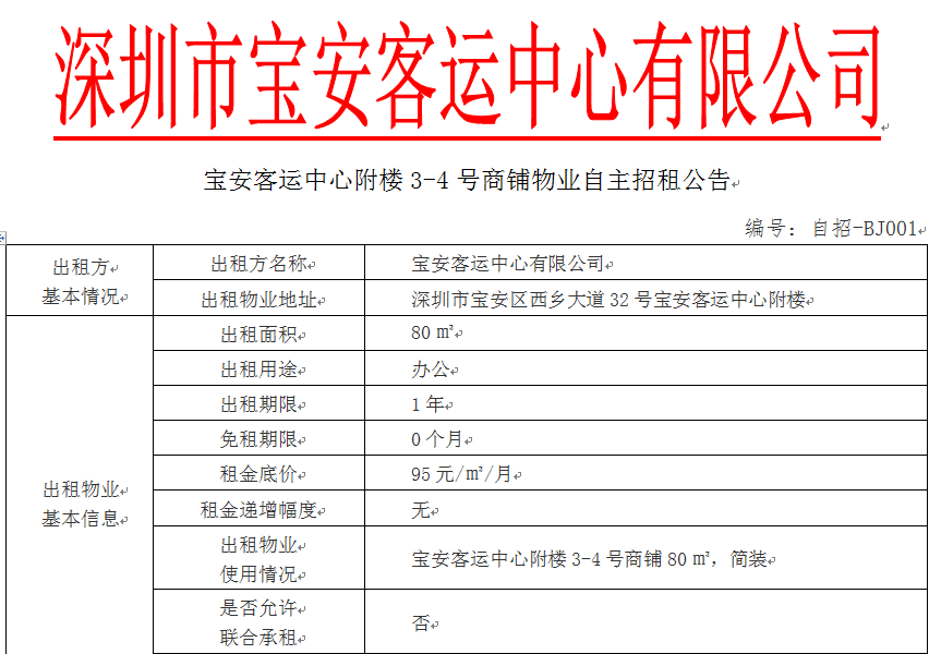 宝安客运中心附楼3-4号商铺物业自主招租公告