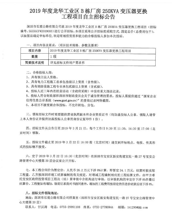 2019年度龙华工业区B栋厂房250KVA变压器变换工程项目自主招标公告
