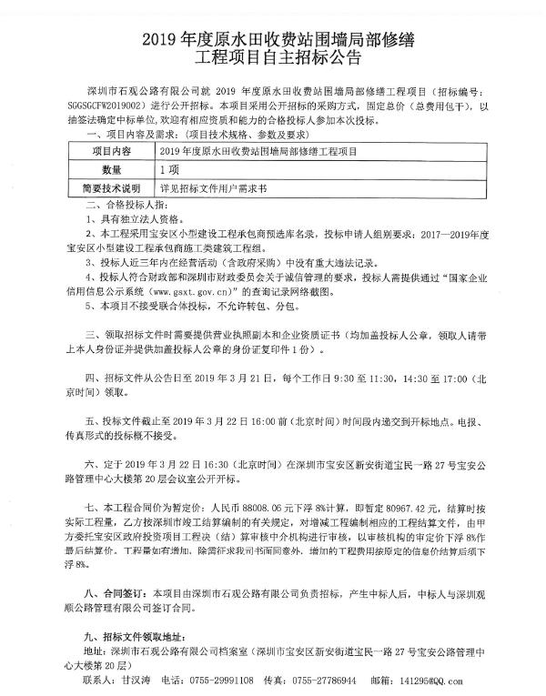 2019年度原水田收费站围墙局部修缮工程项目自主招标公告