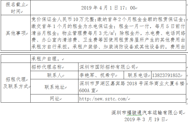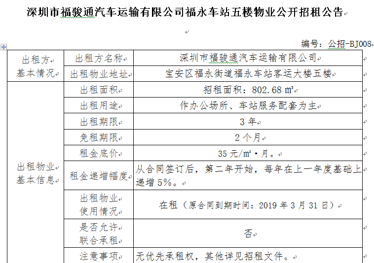 深圳市福骏通汽车运输有限公司福永车站五楼物业公开招租公告